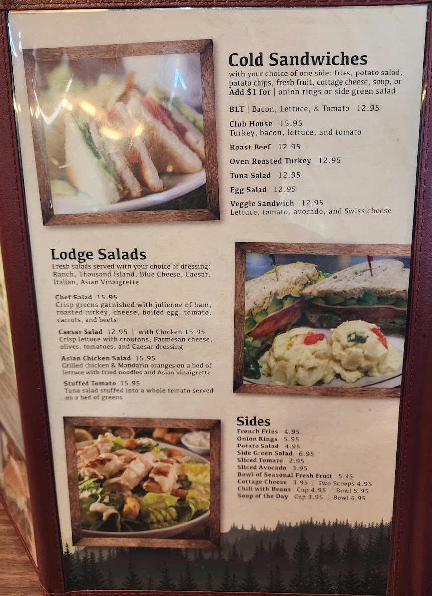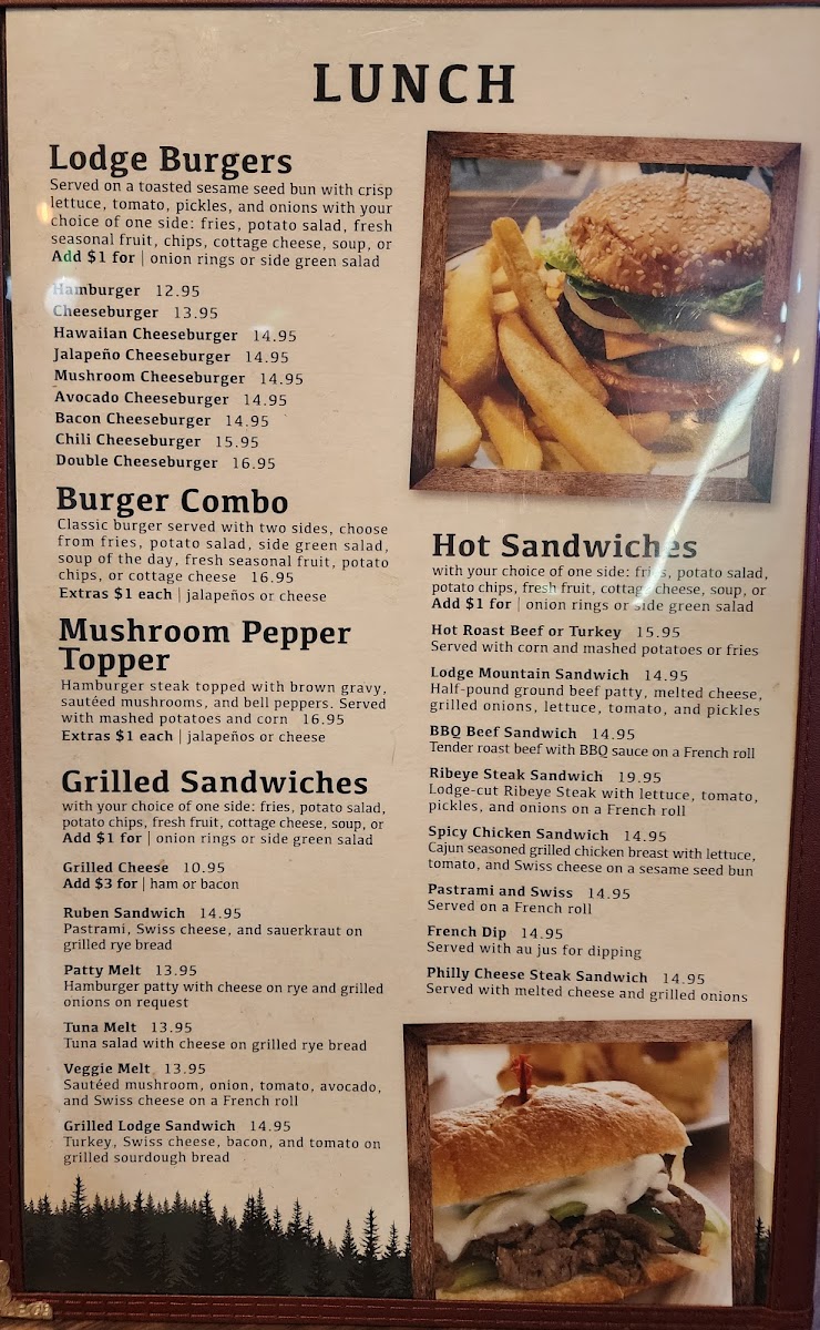 Lunch Offerings: The lunch menu centers around a variety of burgers, including options such as double cheeseburgers, avocado cheeseburgers, BBQ bacon cheeseburgers, and a veggie burger. The menu also includes a burger combo served with a choice of two sides, which range from fries and potato salad to fresh fruit and cottage cheese. Sandwich options like the Philly Cheese Steak and Ribeye Sandwich are also available, paired with sides such as onion rings or home fries.